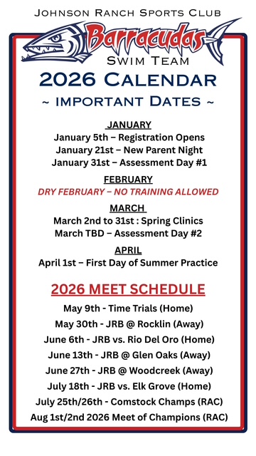 The search is still on to fill a few more board positions for the Johnson Ranch Barracudas! If interested, please reach out for more details! We can't wait to have a great 2026 season and we'd love to have you on our team!